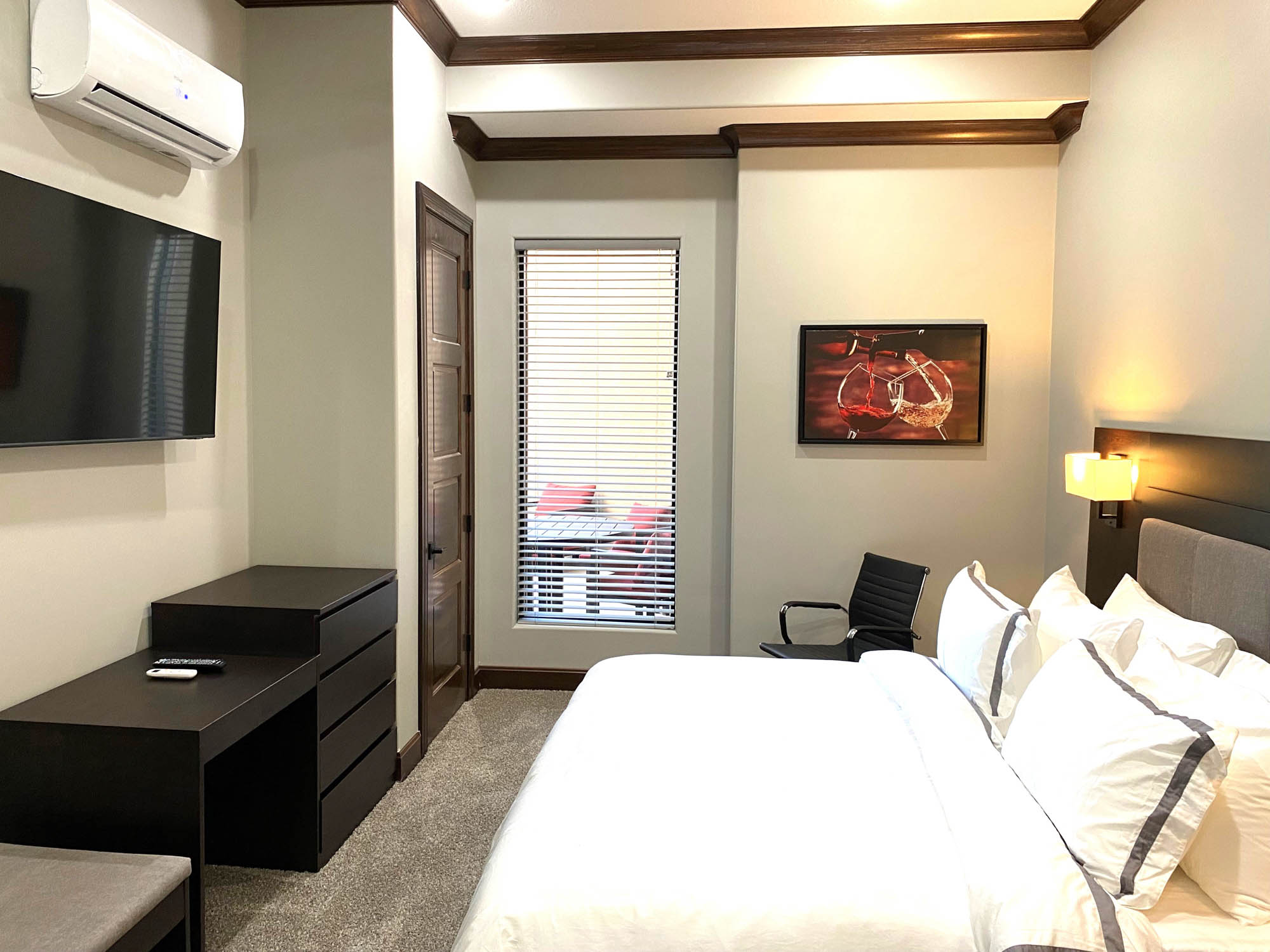 2 luxury one bedroom Executive & Honeymoon suites with kitchenettes & granite countertops, 12' ceilings, 8' tall doors, large patios, private living area and private bedroom with luxury bathroom suite, highspeed fiberoptic internet, and reserved private parking space.